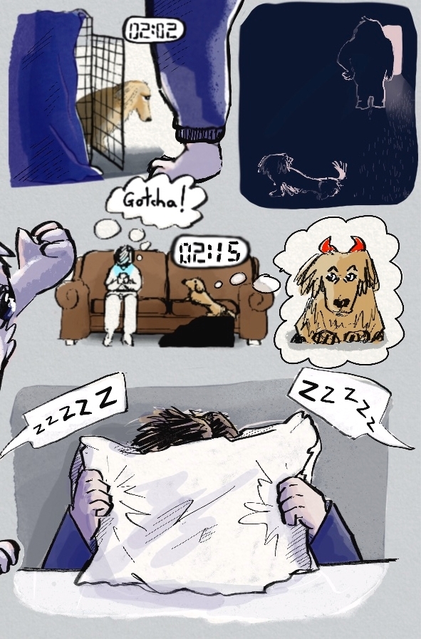 2.02 a.m. : Mum throws off her warm, hugging duvet. Dresses in joggers off the floor. The crate door squeaks open…